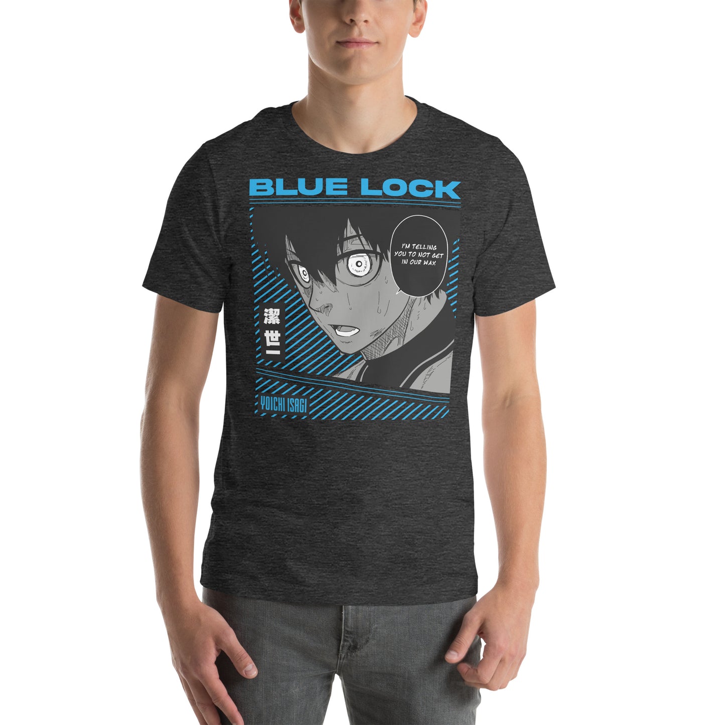 An intense design of Isagi Yoichi, the main protagonist of the Blue Lock anime and manga series. The quote "I'm telling you to not get in our way" captures his true egoist nature as the future ace.